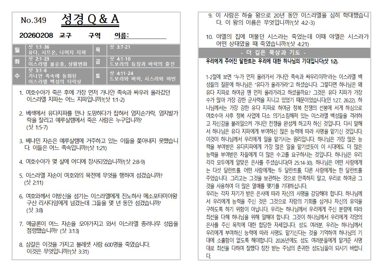 2026년 2월 8일 주일 교회소식 및 Q&A